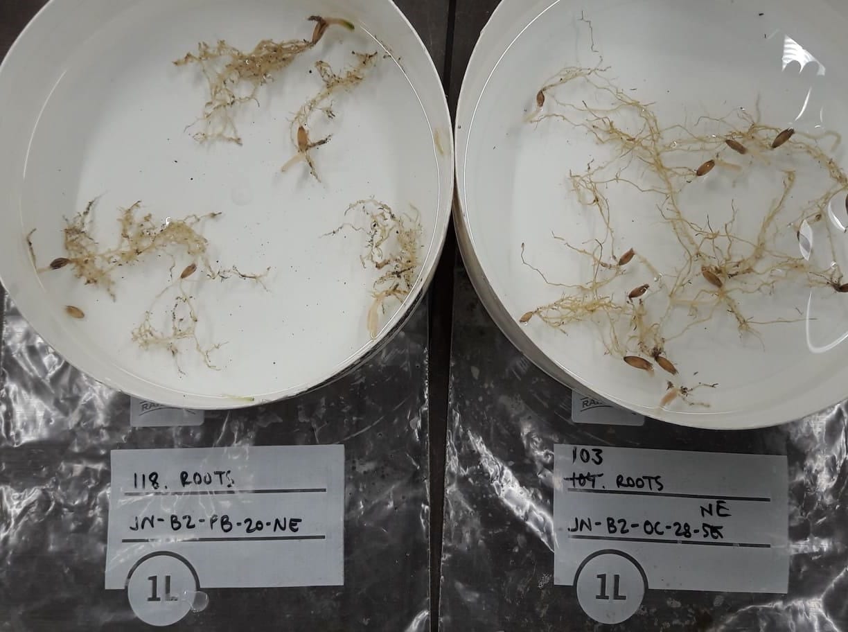 Maanäytteiden lisäksi keräsimme näytteitä kaurasta kesä-, heinä- ja elokuussa siten, että kasvinäytteet olivat sijainniltaan ja ajaltaan yhdistettävissä maanäytteisiin. Koeruutujen välissä pesimme näytteenottovälineet vedellä, minkä jälkeen pyyhimme ne etanolilla. Pakkasimme näytteet puhtaisiin valmiiksi merkittyihin muovipusseihin kylmälaukkuihin, jotta ne eivät sekoittuisi toisiinsa ja pysyisivät viileinä. Näytteenottoihin osallistui aina 6-7 ihmistä, jotta näytteenotto saatiin tehtyä päivässä. Maastonäytteenoton jälkeen jatkoimme työskentelyä seuraavana päivänä laboratoriossa.