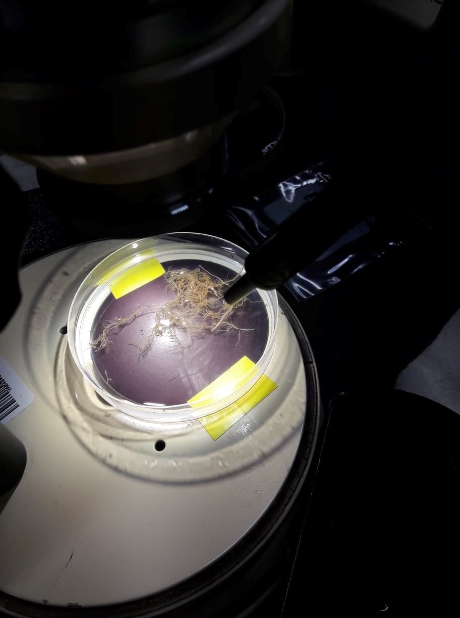 Kesällä kasvukauden aikana kokonaisia kauroja kerättiin versoineen ja juurineen eri käsittelyaloilta ja pakastettiin. Syksyllä talven lähestyessä alkoikin sitten juurien pesu- ja värjäysurakka (Kuvat 1 ja 2). Pesun yhteydessä juurista pestiin pois kaikki maapartikkelit ja hienojuuria poimittiin erilleen kauran juurissa olevien keräsienijuurisienten määrien arviointia varten (Kuva 3) sekä tulevia DNA-töitä varten.