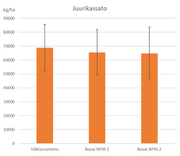 Kaikkina vuosina Soilfood Boost NPKS on tuottanut vastaavan juurikas- ja sokerisadon kuin väkilannoite. Boost NPKS -lannoitetun juurikkaan kolmen vuoden keskisato, mukaan lukien olosuhteiltaan vaikea vuosi 2020, on ollut yli 65 t/ha ja sokerisato yli 11 t/ha. Vuonna 2019 juurikassato oli 84 tonnia hehtaarilta ja sokerisato 14,5 t/ha. Kuvissa on esitettynä kokeiden kolmen vuoden keskisadot eri lannoituskäsittelyille.