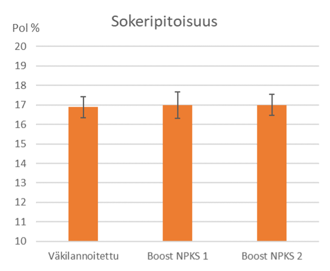 SJT:n ruutukokeessa saavutettiin Boost NPKS Premiumilla väkilannoitusta vastaava juurikas- ja sokerisato, tilakokeessa Boost NPKS Premium pärjäsi selvästi väkilannoitettua verrokkia paremmin.[EV1]