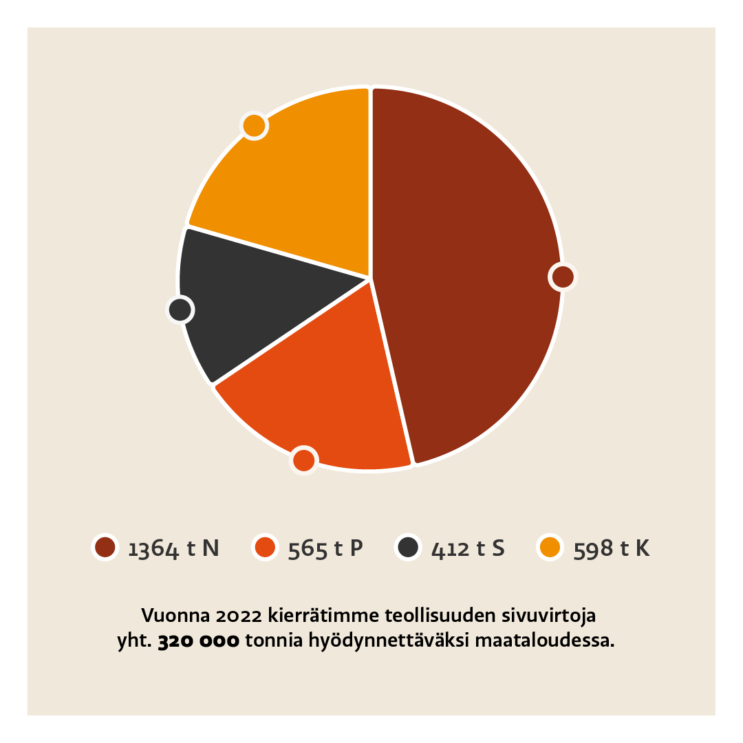 Kaikkiaan maatalouteen kierrätettiin 1 364 tonnia typpeä, 598 tonnia kaliumia, 565 tonnia fosforia, 412 tonnia rikkiä ja 22 833 tonnia kalsiumia.