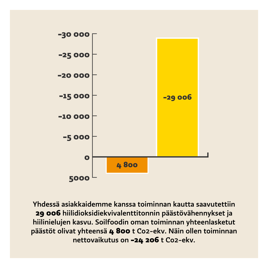 – Yhteistyöllämme saavutimme 29 006 CO2-ekvivalenttitonnin päästövähennykset ja hiilinielujen kasvun. Kun luvusta vähennetään Soilfoodin operatiivisen toiminnan päästöt, on nettovaikutus 24 206 tonnia. Nettopäästövähennys vastaa noin 2 350 suomalaisen vuosittaista hiilijalanjälkeä, Järnefelt kertoo.